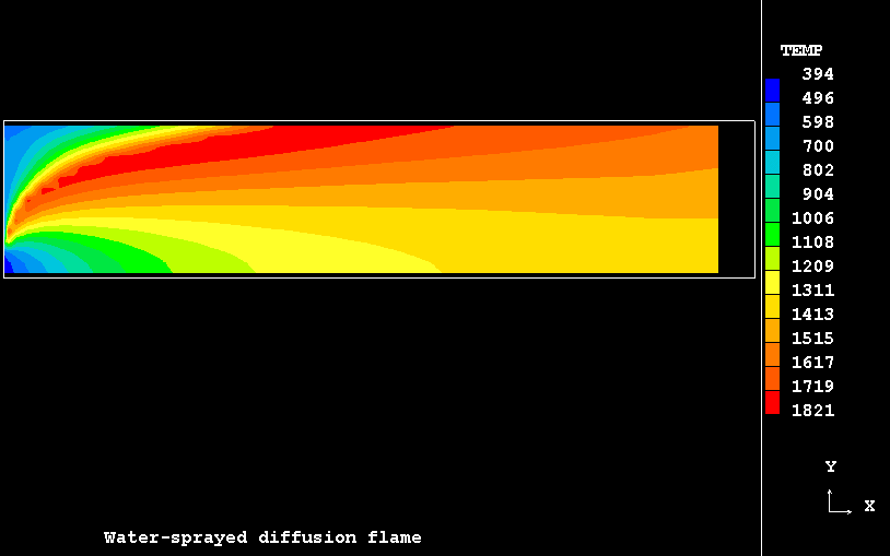 The present case consists of a rectangular duct with unrestricted exhaust in which the gaseous methane-fuel burn in a stream of heated air. The methane premixed with the certain amount of finely dispersed water droplets is introduced through a slot on the symmetry plane of the duct, and the secondary air, also premixed with water fines, is introduced through a slot inlet surrounding the fuel entry.