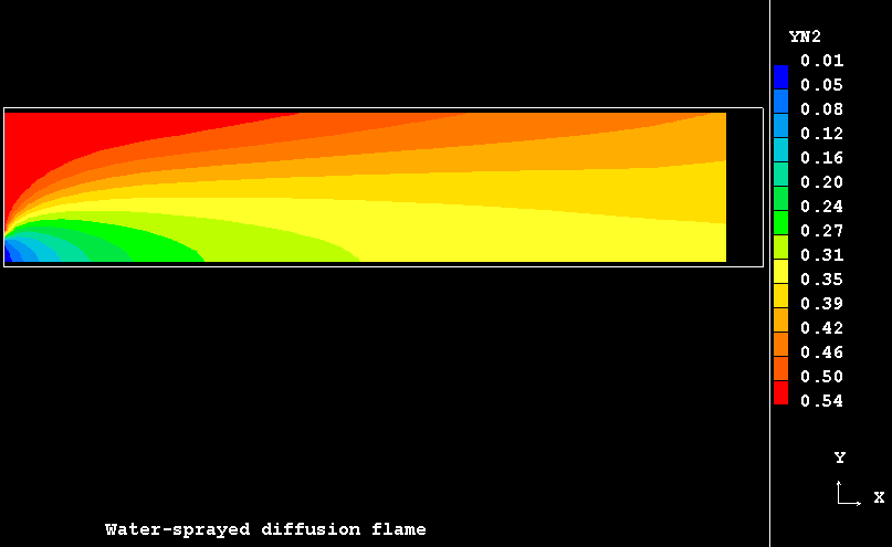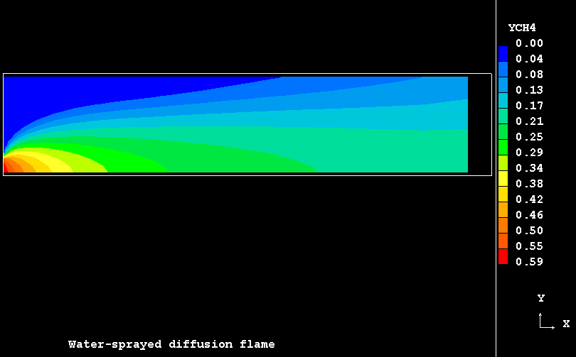 The case presents the implementation in PHOENICS of an extension for SCRS model to handle the turbulent flow, mixing and evaporation of a finely dispersed water droplets in a co-flowing combusting streams resulting from the admission of two separate coaxial turbulent jets of gaseous fuel and oxidant into a duct.