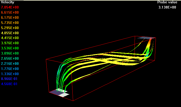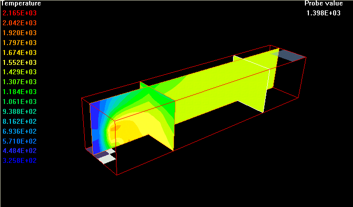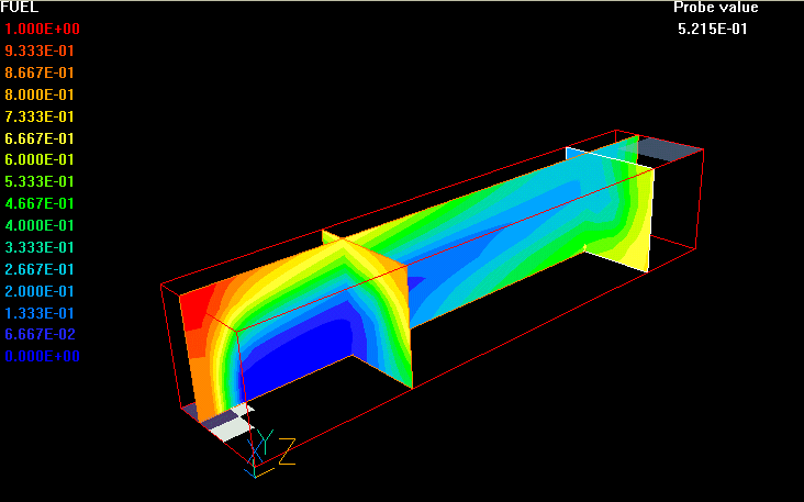 The gases are ignited on the entry and steady state combustion takes place. The combustion products with constant absorption coefficient of 0.4 and constant scattering coefficient of 0.1 flow, in a swirling motion, towards four exhaust openings located at the corners of the top wall.