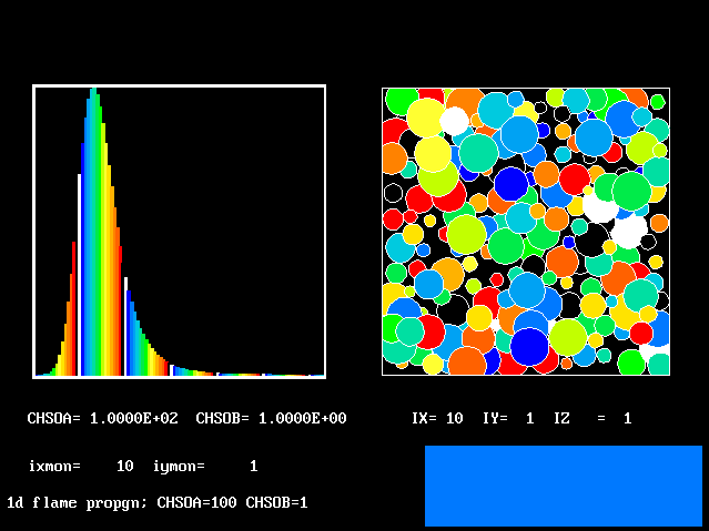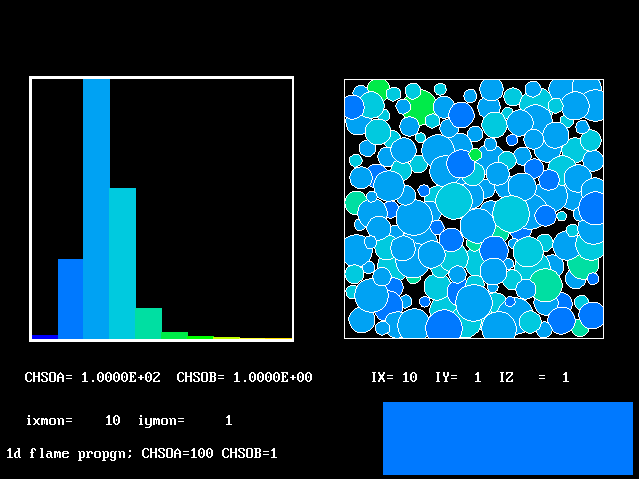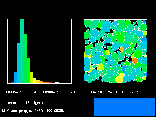 The displays on the left will show the population distributions in a mixing layer, the leaner mixtures being on the left and the richer on the right.