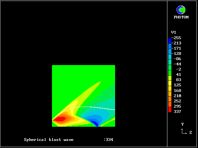 This picture shows, on a plot of radius (vertical) versus time (horizontal) the contours of radial gas velocity consequent on the release of a sphere of compressed gas, created for example by a bomb.