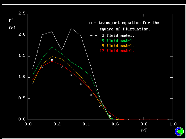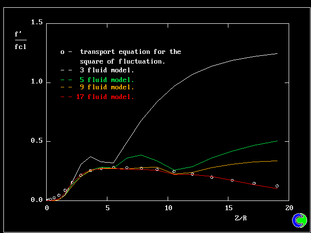 The radial variation of the averaged concentration fluctuations are shown in the next picture. The full lines are multi-fluid predictions and the points are the computations of the transport equations for the square of the concentration fluctuations.
